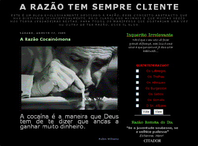 As cantigas de escárnio e mal dizer do século XXI. Se porventura conseguirem que o autor deste blog diga bem de alguma coisa é porque naquele dia acordou para o lado errado. A Razão passeia diariamente pela realidade não poupando nada e ninguém. É a versão bloguística de uma debulhadora mecânica, ceifando, empacotando e lançando diariamente uma razão ao acaso, geralmente sarcástica e bem humorada. Um dos encantos da Razão são os participativos comentadores que apimentam diariamente o blog com comentários tão ou mais cáusticos que os próprios posts. Uma advertência: cuidado com a tribo de somalis que circunda as proximidades deste blog.